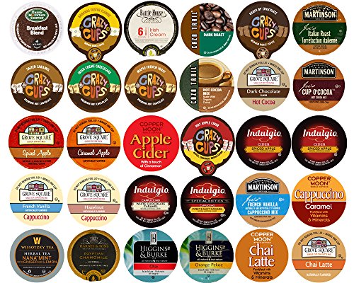 Contains: 1 Grove Square Caramel Cappuccino 1 Grove Square French Vanilla Cappuccino one Grove Square Hazelnut Cappuccino 1 Grove Square Pumpkin Spice Cappuccino one Martinson\'s French Vanilla Cappuccino one Grove Square Chai Latte one Higgins & Burke Chai Tea one Caza Trail Hot Cocoa Combine one Crazy Cups Irish Creme Cheesecake Scorching Chocolate 1 Crazy Cups Maple French Toast Sizzling Chocolate 1 Crazy cups Salted Caramel Hot Chocolate one Grove Square Salted Caramel Sizzling Cocoa one Martinson\'s Cup- of Coco Sizzling cocoa one Crazy Cups Sizzling Apple Cider 1 Grove Square Apple Caramel Cider one Grove Square Spiced Apple Cider one Caza Trail Pumpkin Spice Flavored Coffee 1 Crazy Cups Peppermint Chocolate Mocha Flavored coffee 1 Crazy Cups Pumpkin Vanilla Flavored Coffee one Crazy Cups White Christmas Flavored coffee 1 Green Mountain Pumpkin Spice Flavored Coffee 1 Martinson\'s Winterfest Flavored coffee 1 Harney & Sons Scorching Cinnamon Spice Tea 1 Twinings Chai Pumpkin Spice Tea one Twinings Chai Spice Apple Tea 1 Twinings Winter Spice Tea