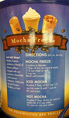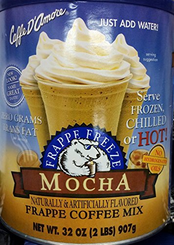 32oz Caffe D\'Amore Frappe Freeze Mocha Frappe Coffee Mix. New & sealed in factory packaging. One particular tub per purchase. Net fat 32oz (2 Lbs) per tub. Effortless to prepare and tasty! The possibilities are countless! Just include water. Serve frozen, chilled or sizzling. Zero grams Trans Unwanted fat. Excellent for Caramel Java Freeze, Coconut Mocha, Funky Monkey, Peanut Cup Mocha (see recipes on label packaging). About 27 servings per tub. Serving size 3 tablespoon.