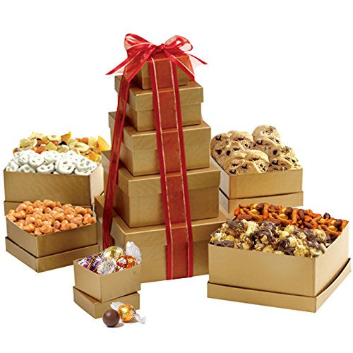 • Gift tower includes: Mini Yogurt Pretzels (5oz), Chocolate Chip Cappuccino Cookies (4oz), Deluxe Chocolate Drizzled Caramel Popcorn (4oz), Assorted Lindt Truffles(5pc), Botana Cajun Mix (4oz), Butter Toffee Peanuts (3oz)