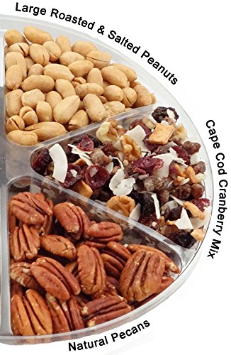- Gift tray includes: smokehouse flavored almonds, salted & roasted peanuts, cape cod cranberry mix, pecan halves, salted pistachios and a dried fruit medley