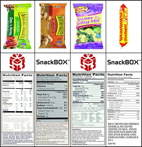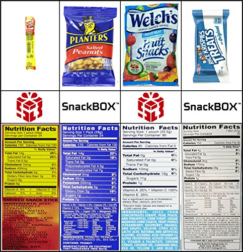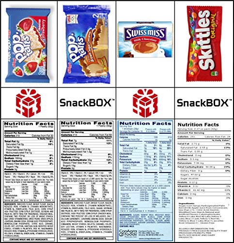 SnackBOX created this care package deal with \"present\" in thoughts. With 50 things in this care package deal there is some thing tasty for absolutely everyone Contents: (two) one.5 oz Nature\'s Valley Granola Bars, (two) 2. oz Kar\'s Sweet and Salty Trail Combine, (one) 2. oz Oreo packs, (2) 2. oz Popular Amos Chocolate Chip cookie packs, (2) one.75 oz Chex Combine, (two) one.75 oz Gardetto\'s, (two) one.5 oz Chez-Its, (1) 1.9 oz Nutter Butter, (1) 1.four oz Chips Ahoy, (one) 1.8 oz Oreo Golden, (1) 3.67 oz Pop Tarts Strawberry, (one) three.52 oz Pop Tarts Brown Sugar Cinnamon, (2) .84 oz Chewy Granola bars, (one) two.17oz Skittles bag, (1) two.07 oz Starburst Unique, (4) .28 oz Slim Jim, (4) .08oz Crystal Light packets, (4) 1 oz Planters Salted Peanuts, (4) .9oz Welch\'s Mixed Fruit Snacks, (six) .73 oz Swiss Miss Hot Chocolate, (four) Tootsie Pops, (2) 1.three oz Rice Krispies Treats Bars.