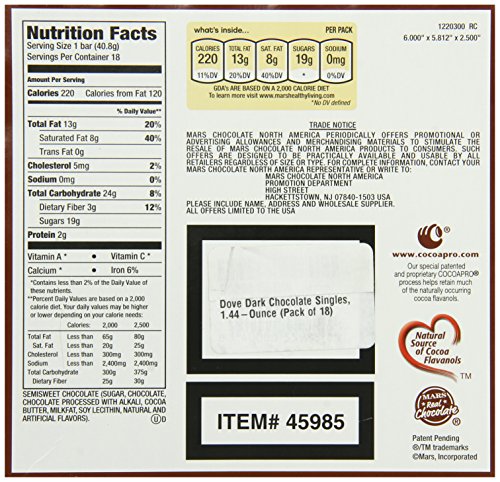 - Contains eighteen (18) 1.44-ounce bars of DOVE Dark Chocolate