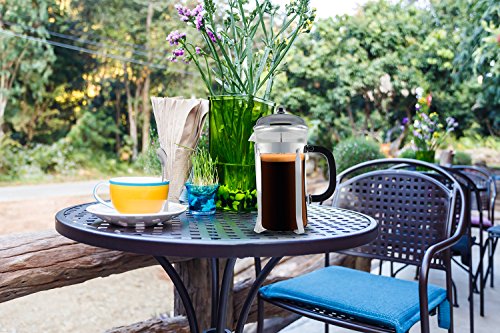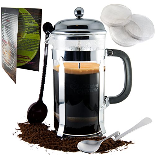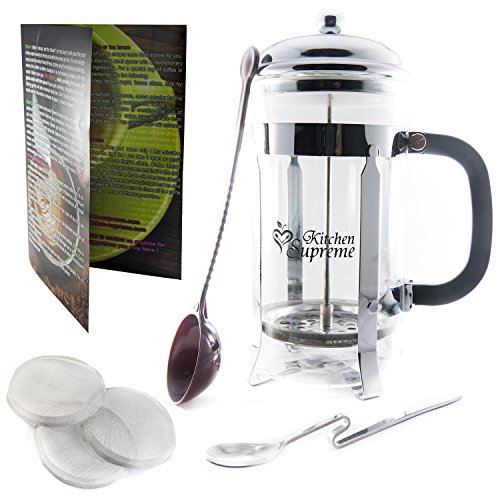 - SUPERIOR BUNDLE: The Kitchen Supreme French Press for Coffee, Espresso and Tea Maker 1 Liter (about 8 small coffee cups or 4 coffee mugs) + 1 SPOON made from thick stainless steel for honey, sugar and desert + 4 FILTER screens (The only Coffee Maker with 4 Screens System for no more grounds in your coffee) + 1 Coffee/Tea SCOOP + HARD COPY Instructions and Barista Secrets + the latest special type of packaging: Amazon Frustration Free Packaging.