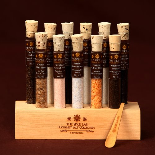 The salt collection includes 11 Pyrex test tubes with natural cork stoppers. A handmade base from reclaimed shipping pallets.Salts in Assortment Variety #2 Chardonnay Oak Smoked - Black Hawaiian - Hickory Smoked - Japanese Aguni - Himalayan Pink - Cyprus Flake Black - Sicily \"Salt Road\" Trapani - Sal del Mar Manzanilla Mexico - Persian Blue Diamond - Alderwood Smoked - Lake Grassmere New Zealand - The wooden base is handcrafted from discarded shipping pallets. Manufactured in USA. Each and every Check Tube contains .8 to one.three Oz of salt dependent on the density of every salt. A Wonderful Present to any Gourmet.