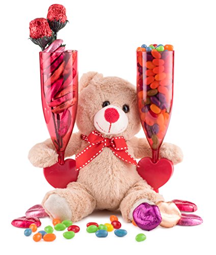 - Gift Includes Foil Wrapped Milk Chocolate Lips, Conversation Jelly Beans, 2 Red Plastic Champagne Flutes, Beige 7 inch Plush Teddy Bear, and 2 Red Foil Wrapped Milk Chocolate Roses.