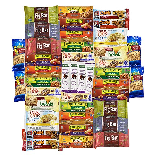 • Bundle Includes: 2 Belvita - 1.76 oz, 4 Quaker Chewy Bar - 0.84 oz, 2 Nature Valley Protein Chewy - 1.42 oz, 4 Fiber One Bar - 1.4 oz, 4 Kashi Bar - 1.2 oz, 4 Planters Peanuts - 1 oz, 4 Nature Valley Granola Crunchy - 1.49 oz, 2 Fiber One Brownie - 0.89 oz, 6 Natures Fig Bar - 2 oz, 4 Nature Valley Sweet & Salty - 1.2 oz, & 4 Nature Valley Trail Mix - 1.2 oz