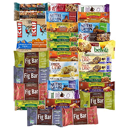 - Variety Pack Includes- 1 Kind Dark Chocolate Nuts And Sea Salt - 1.4oz, 1 Kind Madagascar Vanilla Almond - 1.4oz, 1 Clif Bar Chocolate Chip - 2.4 oz, 1 Clif Bar Crunchy Peanut Butter - 2.4oz, 6 Natures Bakery Fig Bar 2oz Each, 2 Special K Bar - 1.16oz, 3 Nutrigrain Bars - 1.30z, 4 Nature Valley Crunchy Oats n' Honey - 1.50oz, 2 Nature Valley Trail Mix Fruit & Nut Chewy - 1.2oz, 2 Nature Valley Protein Bar - 1.42oz, 1 Fiber One Lemon Cake - 0.89oz, 2 Kashi Chocolate Almond & Sea Salt Granola Bar - 1.2oz, 1 Belvita - 1.76oz, & 2 Fiber One Bar 1.4oz