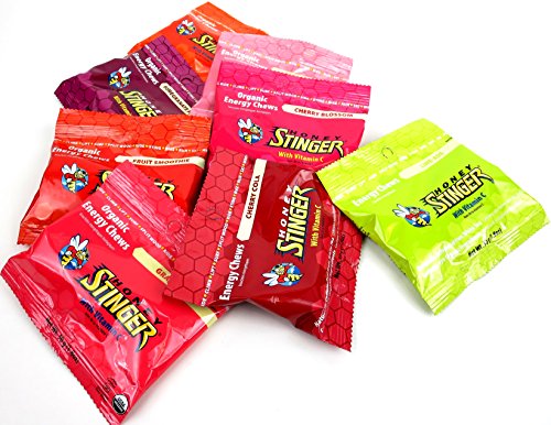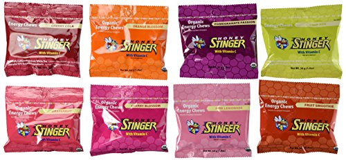 - Includes one 1.8 oz package of Honey Stinger Lime-Ade Energy Chews, one 1.8 oz package of Honey Stinger Cherry Cola Energy Chews, one 1.8 oz package of Honey Stinger Orange Blossom Energy Chews, one 1.8 oz package of Honey Stinger Cherry Blossom Energy Chews, one 1.8 oz package of Honey Stinger Fruit Smoothie Energy Chews, one 1.8 oz package of Honey Stinger Pink Lemonade Energy Chews, one 1.8 oz package of Honey Stinger Pomegranate Passion Energy Chews, and one 1.8 oz package of Honey Stinger Grapefruit Energy Chews