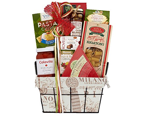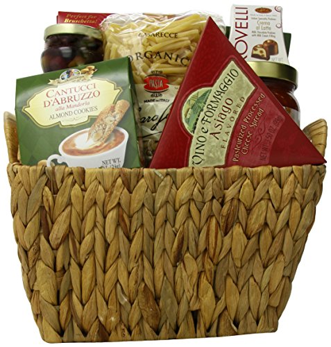 This basket is filled with conventional Italian gourmet foods which includes Cantucci D\'Abruzzo Italian almond cookies, Rovelli milk chocolate pralines, Nonni\'s mozzarella cheese swirls, Bella Campagna rigatoni pasta and Colavita marinara sauce, New York Type twice-baked roasted garlic crackers, Vino e Formaggio asiago cheese spread and olives. It truly is a wonderful decision for those that appreciate the flavors of Italy.